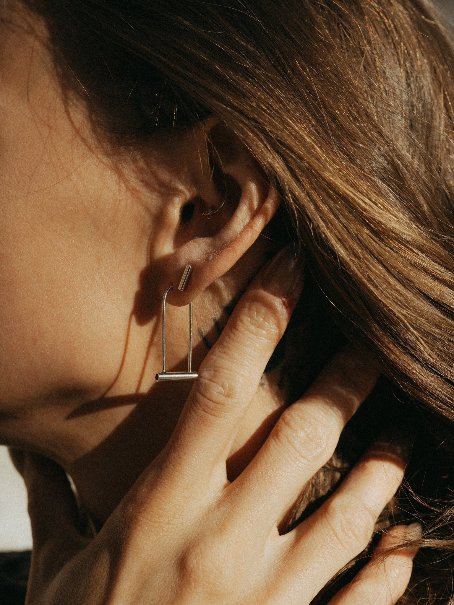 To insert: lightly maneuver the open end of the wire to one side and slide over lobe into piercing. Then once inserted, pinch the open end of the wire into the hole at the end of the tube; you should feel it snap into place.